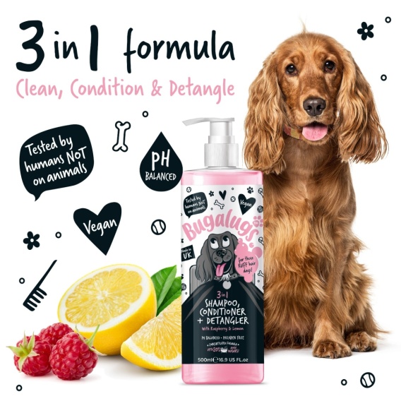 Bugalugs 3in1 Shampoo Conditioner & Detangler - szampon, odżywka i rozkołtuniacz dla psa, o zapachu maliny z cytryną