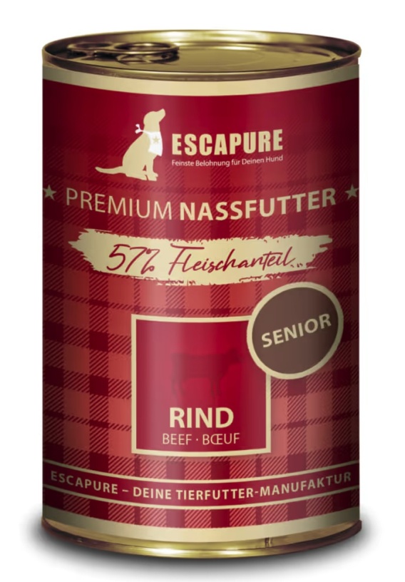 Escapure Senior Rind to najwyższej jakości mokra karma dla psów seniorów, produkowana w Niemczech, inspirowana miłością do zwierząt oraz bogactwem bawarskiej przyrody 🌿. Powstaje wyłącznie z 100% naturalnych, starannie wyselekcjonowanych składników pochodzących od regionalnych dostawców.