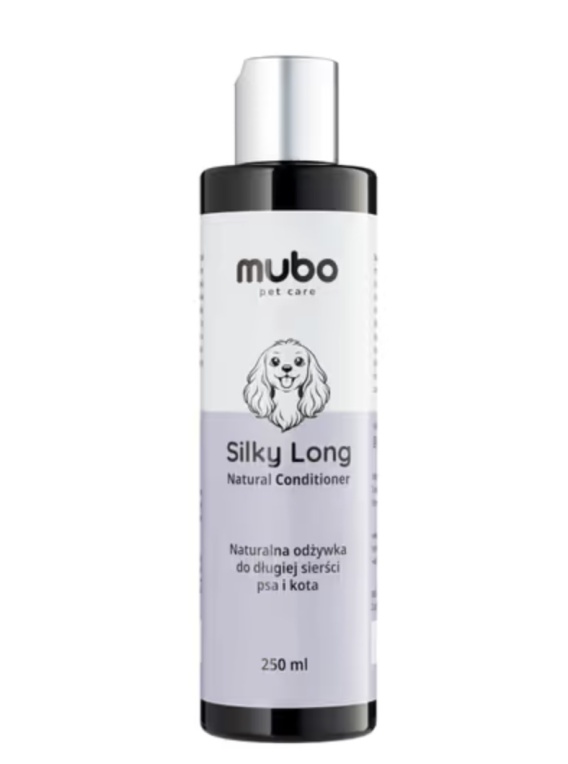 Delikatna, wegańska odżywka dla psa i kota, Mubo Silky Long Natural Conditioner. Przeznaczona do regularnej pielęgnacji długiej sierści pupila. Świetnie sprawdzi się u ras psów, takich jak np. Maltańczyk, Shih Tzu, Yorkshire Terrier, Cavalier King Charles Spaniel, Golden Retriever, Owczarek szkocki długowłosy (Collie), Szpic miniaturowy (Pomeranian), Samojed, Border Collie, Cocker Spaniel oraz kotów np. Maine Coon, kot perski, Ragdoll, kot norweski leśny, kot syberyjski.