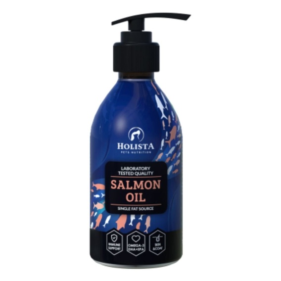 Olej z Łososia Holista to najwyższej jakości, certyfikowany olej pozyskiwany ze świeżego łososia atlantyckiego (Salmo salar). Charakteryzuje się bardzo wysoką zawartością kwasów Omega-3 (EPA i DHA) oraz delikatnym smakiem i zapachem, dzięki czemu jest doskonale akceptowany zarówno przez psy, jak i koty.
