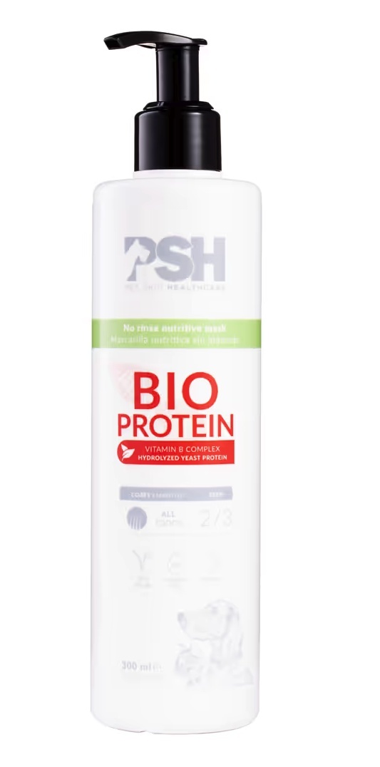Maska bez spłukiwania dla psa i kot, PSH Bio Protein Mask, z linii Daily, przeznaczonej do domowego użytku. Produkt przygotowany z myślą opielęgnacji czworonogów,których sierść jest w złej kondycji spowodowanej niedoborami witamin w związku z nieprawidłowym lub niedostatecznym żywieniem. Zawarty w niej kompleks witamin z grupy B oraz proteiny wnikają w głąb sierści i odbudowuje jej zniszczone warstwy. Maska silnie nawilża suchą sierść i skórę. Stymuluje produkcję keratyny, wzmacniając cebulkę włosa i zapobiegając przedwczesnemu wypadaniu sierści. Nadaje sierści elastyczności i sprężystości, sprawia, że staje się jedwabiście gładka i lśniąca.