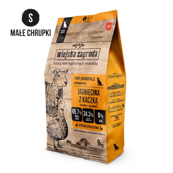 SKŁAD: Jagnięcina (29,5 %, w tym 22 % świeża jagnięcina, 7,5 % suszona jagnięcina), tłuszcz z kurczaka (9,2 %), suszony indyk (7,5 %), suszona kaczka (7,5 %), groch, groch obłuszczony, płatki ziemniaczane suszone, hydrolizowana wątroba z kurczaka (5 %), hydrolizowane białko kurczaka (5 %), białko ziemniaczane, suszone wysłodki buraczane (z buraków cukrowych), siemię lniane, olej z łososia (2 %), lignoceluloza (ze świerku), składniki mineralne, suszone drożdże piwne (0,5 %), suszona cykoria, MOS (manno-oligosacharydy), suszone brokuły, suszone pomidory, suszony szpinak, glukozamina, siarczan chondroityny, suszona żurawina, suszone jagody, ekstrakty roślinne (rozmaryn, kurkuma, cytrusy, goździkowiec, jukka Mojave).